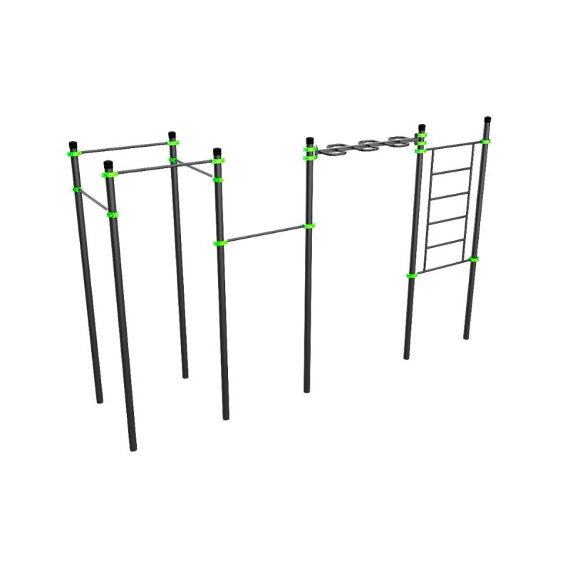 Компактный универсальный комплекс с шведской стенкой, турниками на разных уровнях, одной перекладиной для подтягиваний из виса лёжа и рукоходом-змеевиком. Подходит для упражнений на силу, гибкость и координацию, даёт возможность выполнять базовые элементы воркаута пользователям с любым уровнем подготовки.