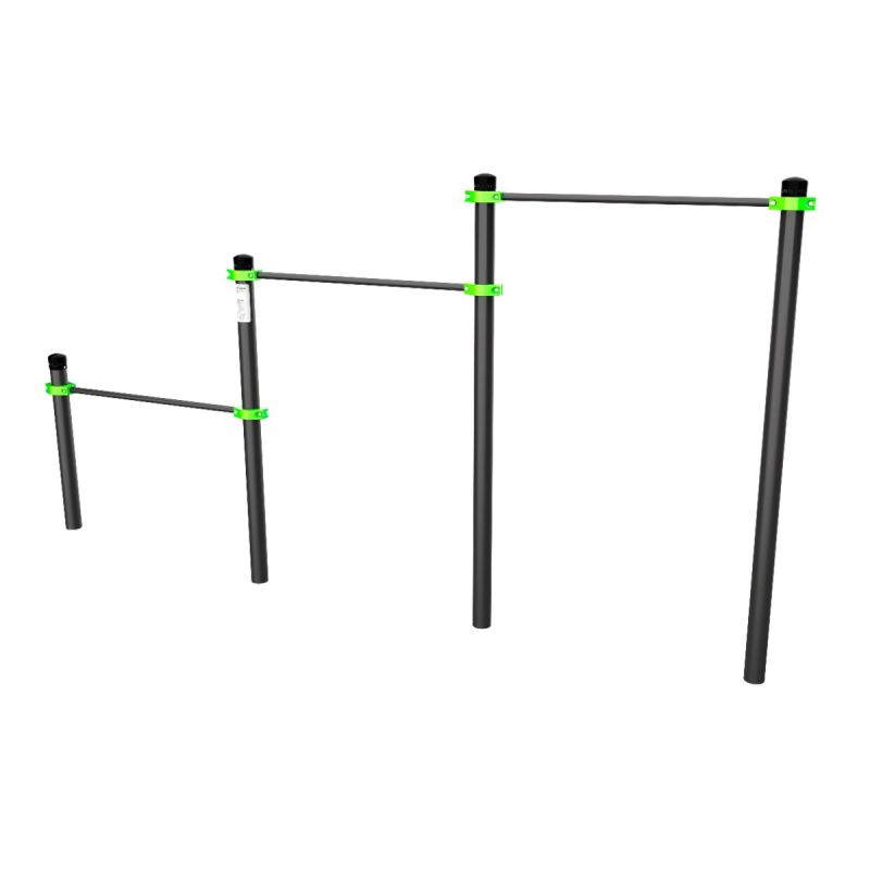 Три турника на разной высоте позволяют тренироваться пользователям любого роста и уровня подготовки. Конструкция подходит для подтягиваний из виса лёжа, отжиманий, упражнений на пресс и растяжки, обеспечивает одновременные занятия нескольких человек.
