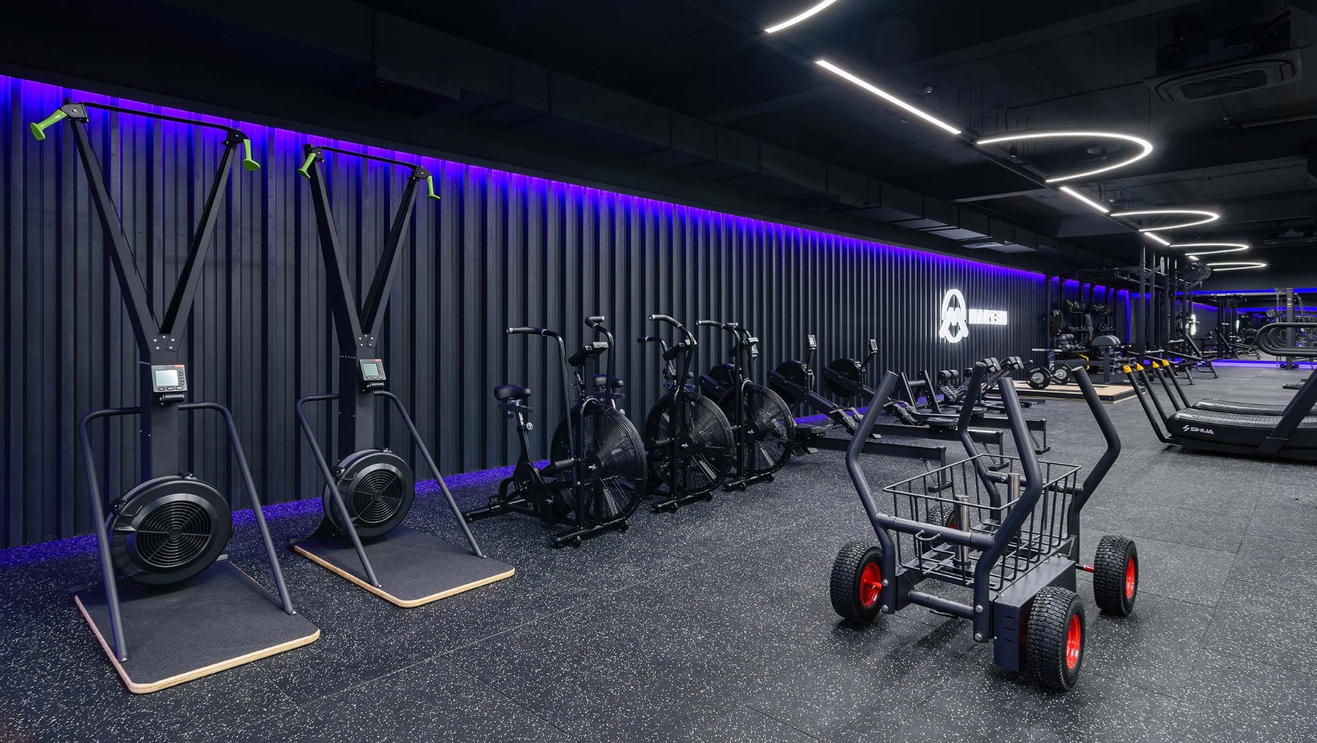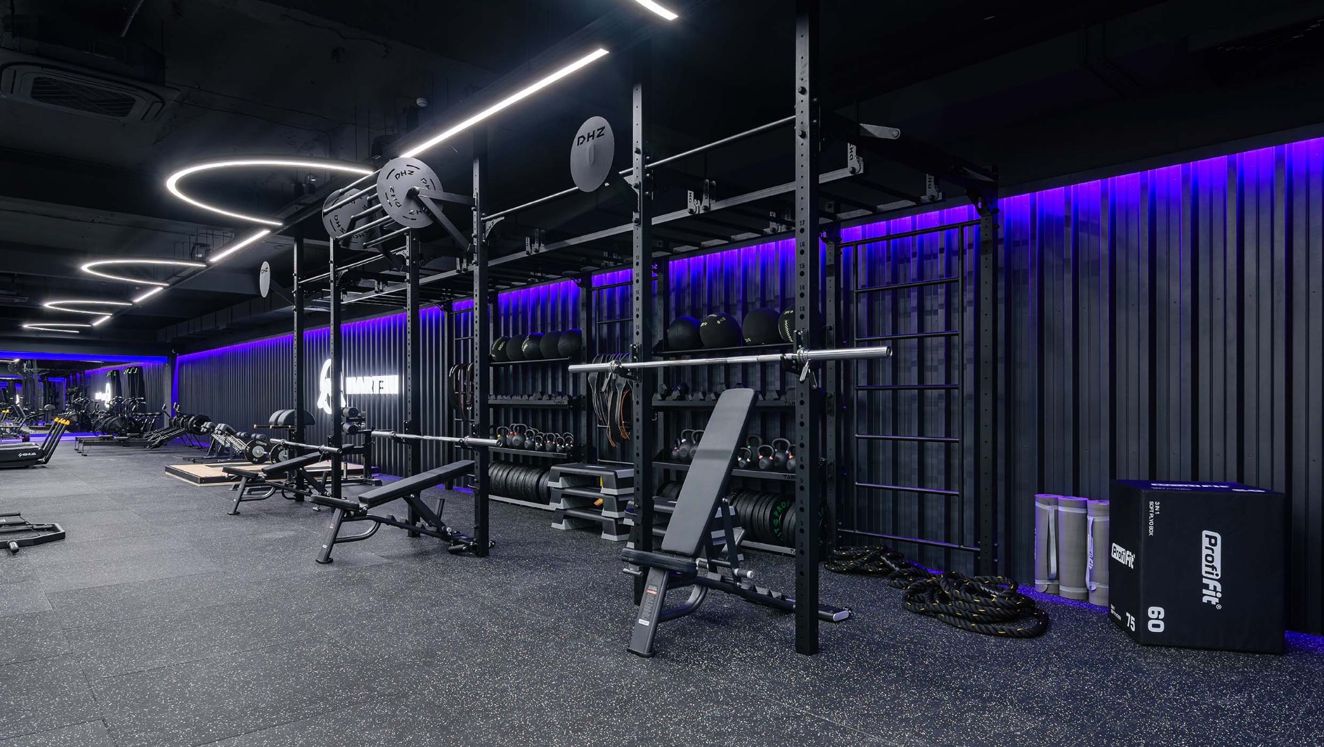 Для оснащения выбраны линейки DHZ Fitness – E7000, U3000D, D900, D600, A600, A2000-A3000, а также кардиооборудование SHUA. Несмотря на разнообразие серий, оборудование формирует единый визуальный и функциональный стиль зала.