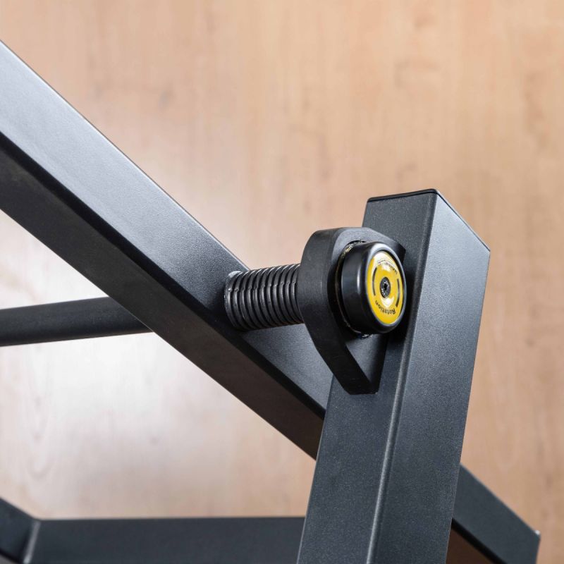 - Опорные элементы оснащены прямоугольными резиновыми подпятниками с отверстиями для фиксации к полу. Такая конструкция гарантирует устойчивость тренажёра, равномерное распределение нагрузки и защиту напольного покрытия от повреждений.